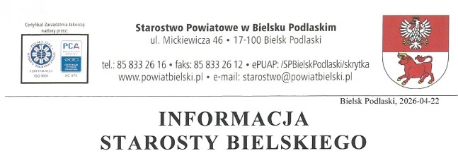 - Dyżury projektanta planu ogólnego gminy Wyszki, które odbędą się w dniach 8 maja 2026 r. w godz. 12:00-14:00 oraz 18:00-19:00 oraz w sali nr 6 w urzędzie gminy (ul. Piórkowska 2, 17-132 Wyszki).