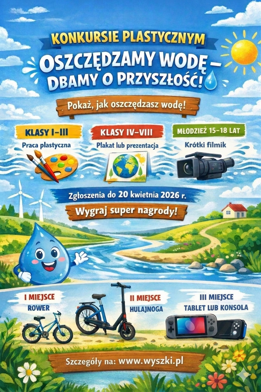 „Oszczędzamy wodę – dbamy o przyszłość”, zorganizowanego w ramach realizacji zadania pn. „Rozbudowa systemu zaopatrzenia w wodę przeznaczoną do spożycia przez ludzi oraz odbioru ścieków bytowych na terenie Gminy Wyszki”.